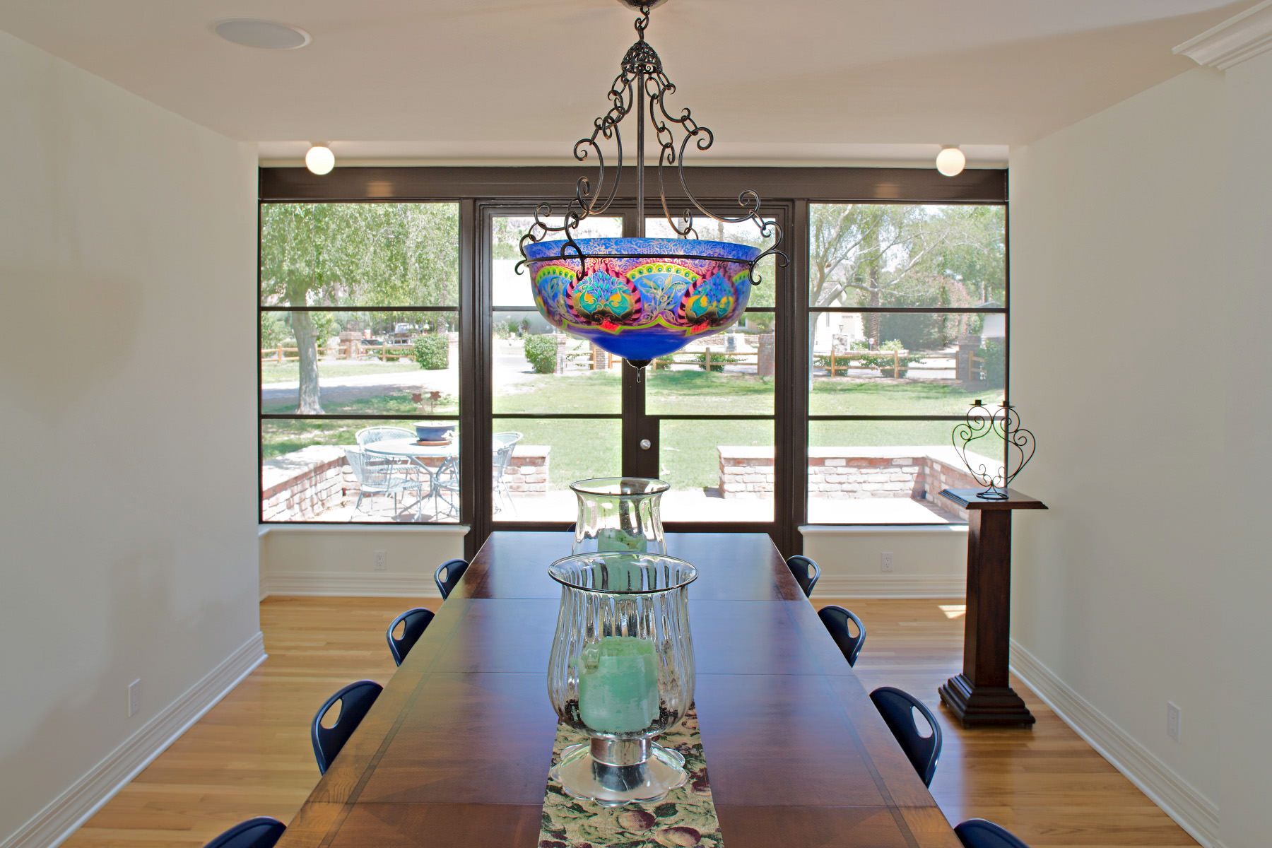 Custom-designed structural-steel windows gave the dining room a strong focal point, bringing light into the interior and framing a dramatic view of nearby Camelback Mountain.