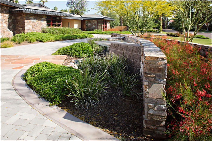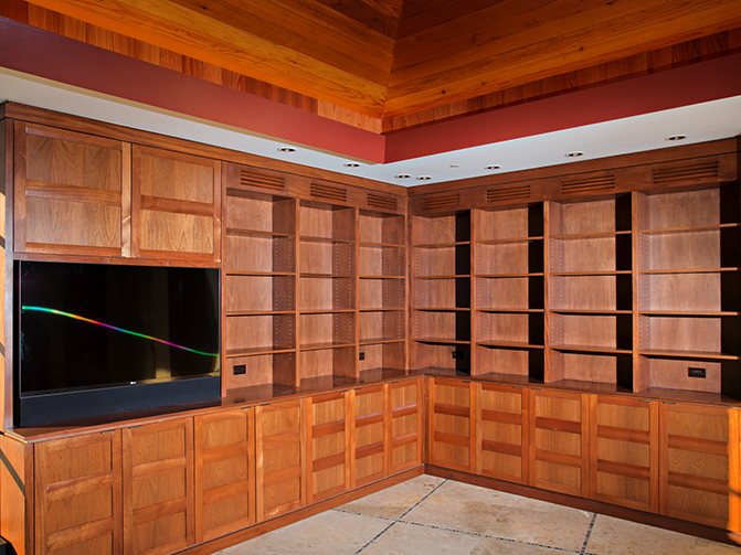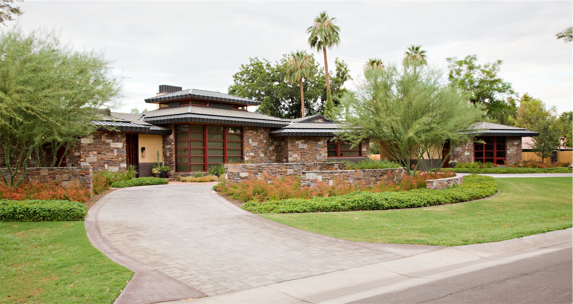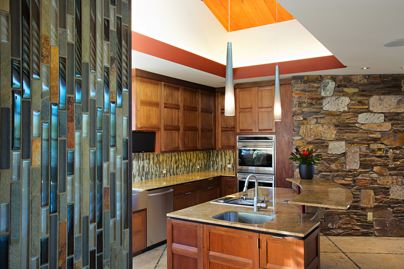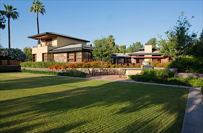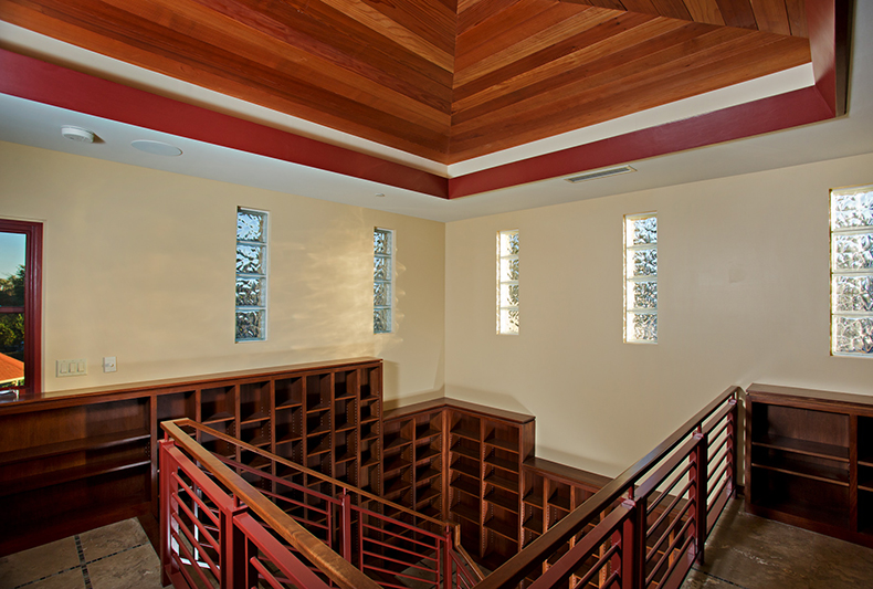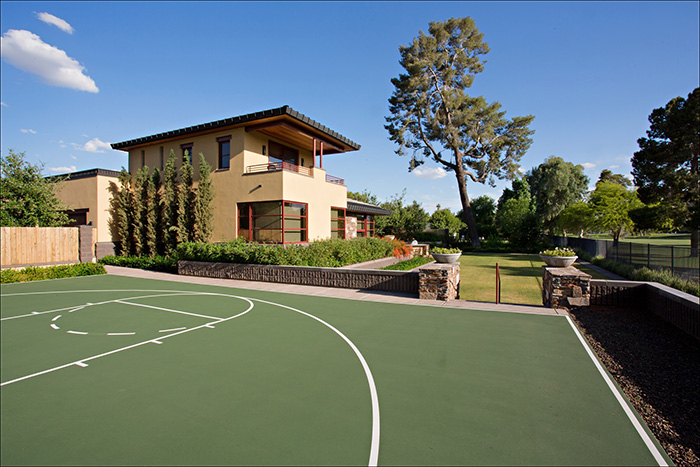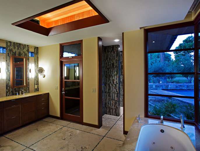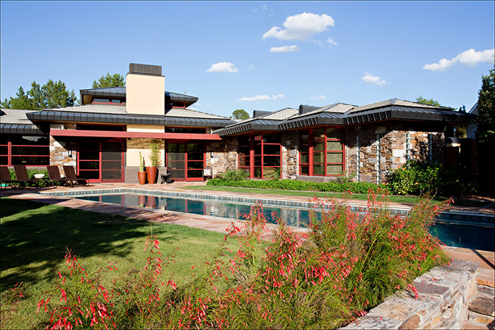 Privacy, an important goal, was achieved by designing the home around a central courtyard flanked by wings of the home. An art studio, exercise room, steam shower and bathroom are housed across the breezeway from the main home.