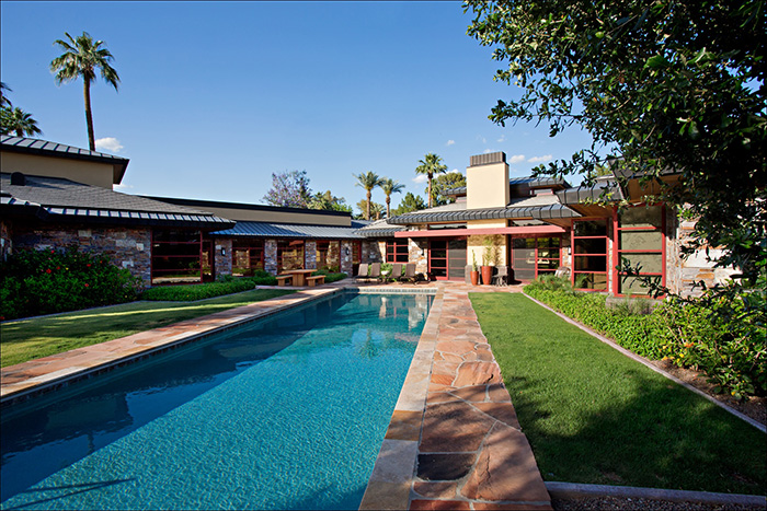 From inside the home, the owners can look out onto the central courtyard toward the new pool and beyond to the adjacent golf course.