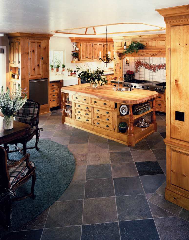 Knotty-pine custom cabinets, custom-milled knotty pine moldings and an elegant tile frieze incorporating a tomato motif contrast with the sleek efficiency of the commercial appliances.