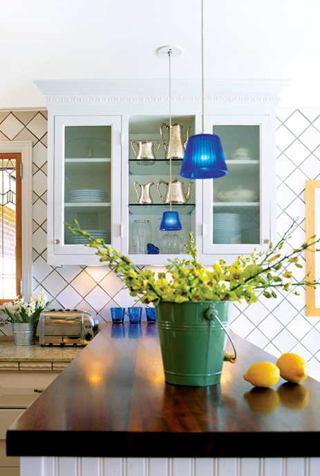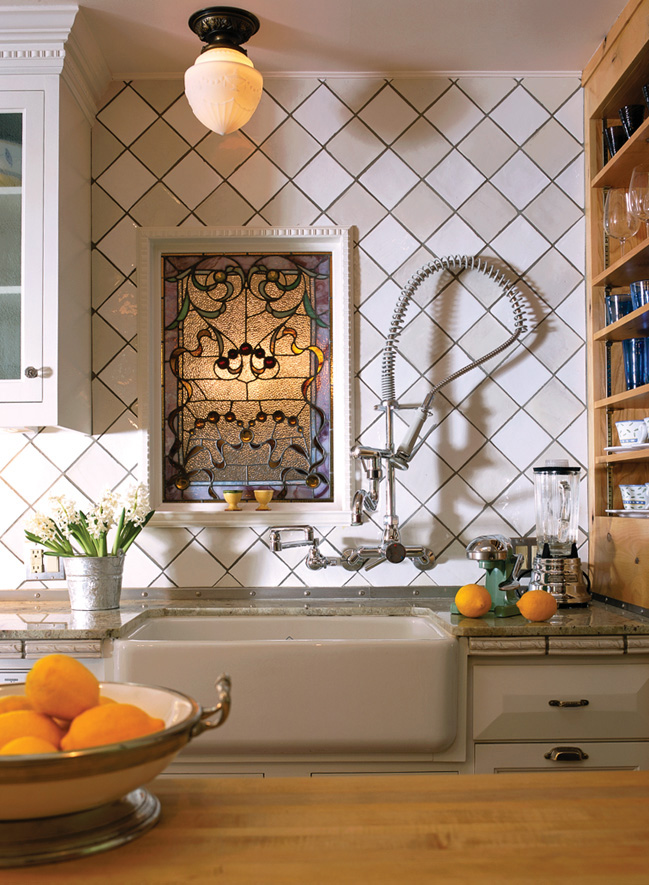 New front doors feature antique beveled glass. An antique stained-glass window in the family room bay window and antique light fixtures add warmth and character. Silver-leaf panels reminiscent of the 1940s enliven the master bedroom and the barrel-vaulted ceiling of the adjacent bathroom. Enhancing the home’s interior charm is an elaborate tile border design which originated with the homeowners’ love of green tumbled marble, with glass-mosaic tile details.