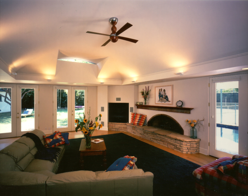 The new design added significant volume by raising the roof, which was lifted over two feet by a home mover, while new exterior load-bearing walls were built. The roof was then lowered and fastened to the new load-bearing walls. In the process, a beam that had divided the living room into small areas was also removed, opening and unifying the space. A new groined barrel vault with an eyebrow dormer window in the family room adds character and admits light.