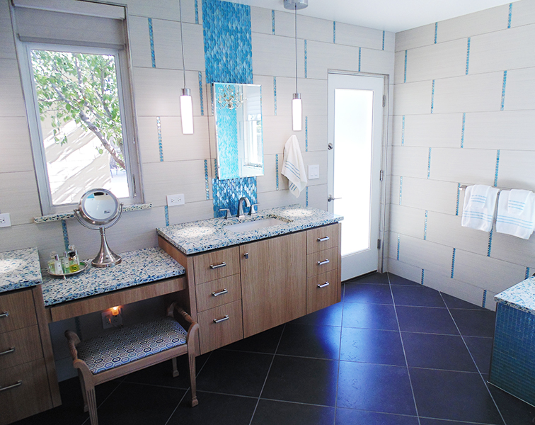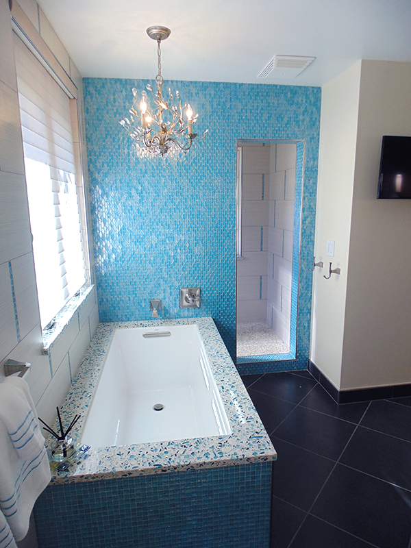 Clyde has a keen sense of space and a great sense of color. Our artistic vision was clear: we wanted a bathroom that looks like a spa. And it's gorgeous. We've got aquamarine or turquoise mosaic tile throughout: some round, some square and some oval. It's a beautiful color, and Clyde found it for half the price we originally expected.