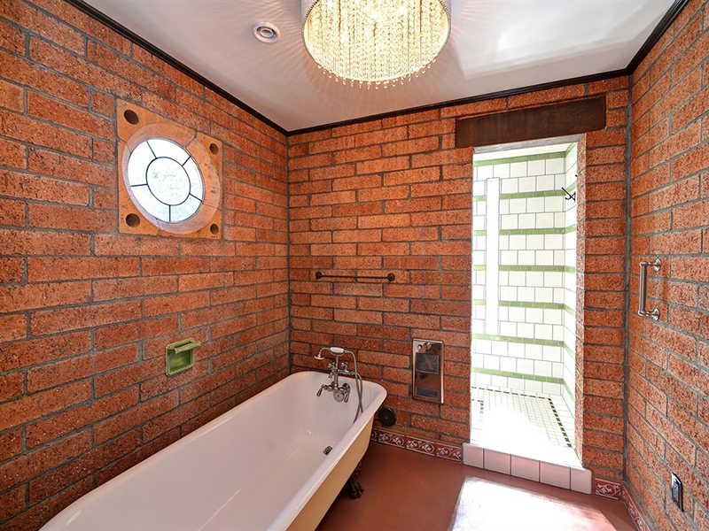 Exterior and interior walls of exposed concrete masonry units are made from recycled bricks, and concrete and cork floors contribute to sustainability. A combination of industrial elements (concrete block, exposed structural-steel beams, copper plumbing pipes used as handrails), along with stained tongue-and-groove sheathing on the walls and the use of architectural salvage (for plumbing fixtures, door hardware and lighting fixtures) give this home the feeling of a traditional territorial home.