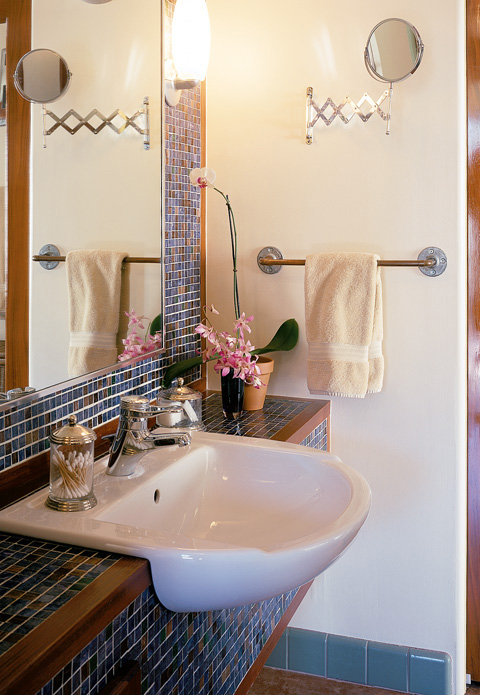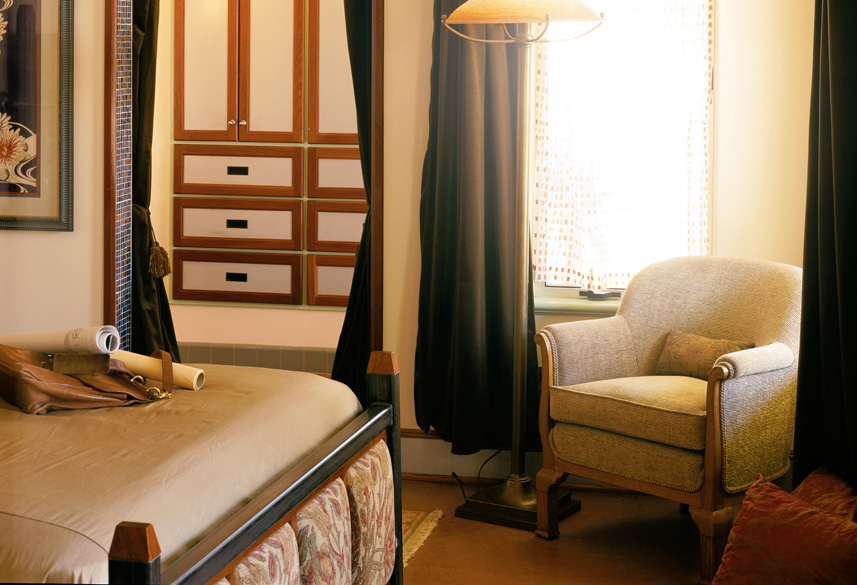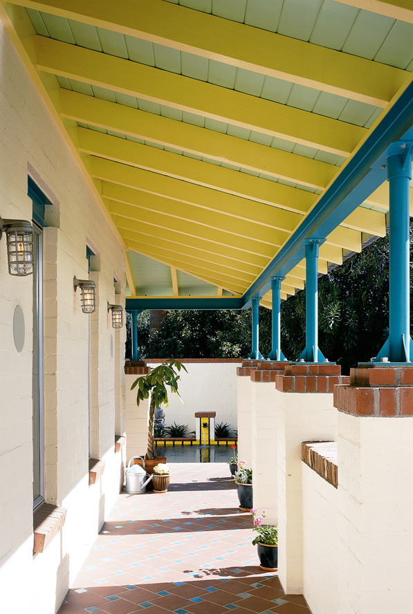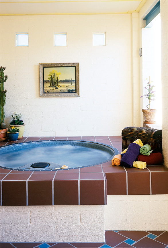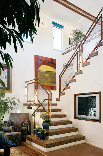 The use of painted concrete masonry units, brick window sills and exposed structural-steel I-beam ridge beams and lintels, stained concrete floors and copper plumbing pipe used as handrails, drapery rods and towel bars contribute to a sense of indigenous Phoenix architecture. Arts & Crafts-inspired detailing such as exposed rafter tails, tongue-and-groove sheathing and unglazed quarry tiles reflect the warmth and comfort, as do doors featuring exotic hardwood with sheet-steel panels.