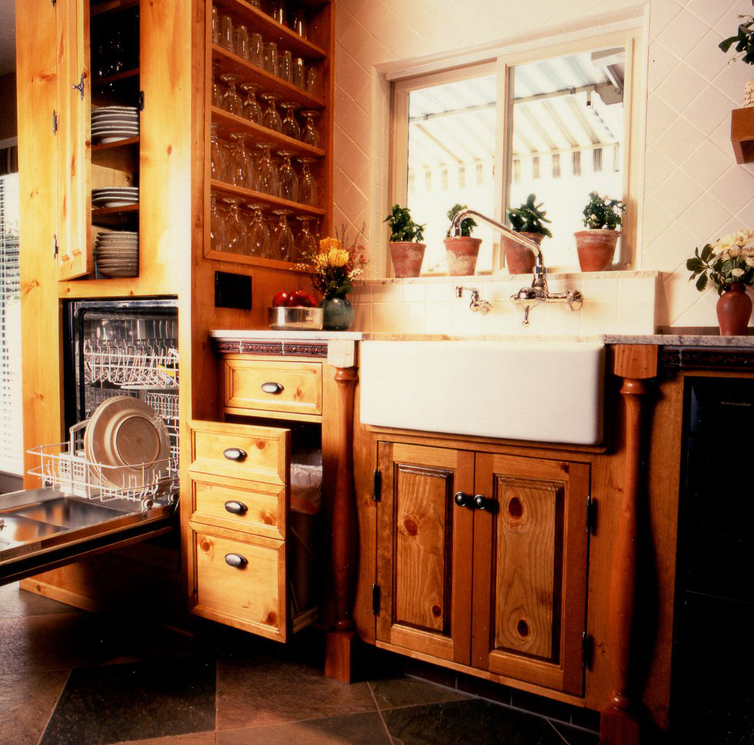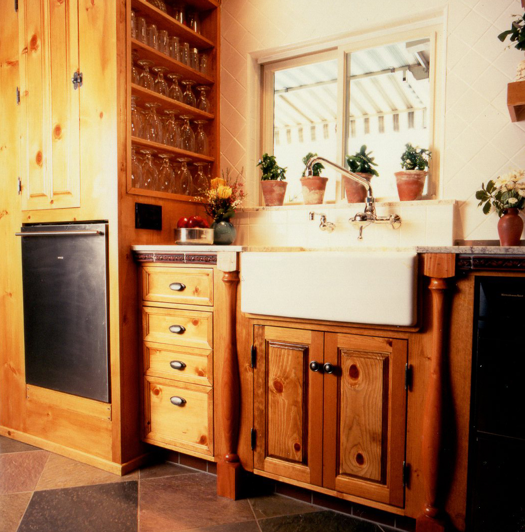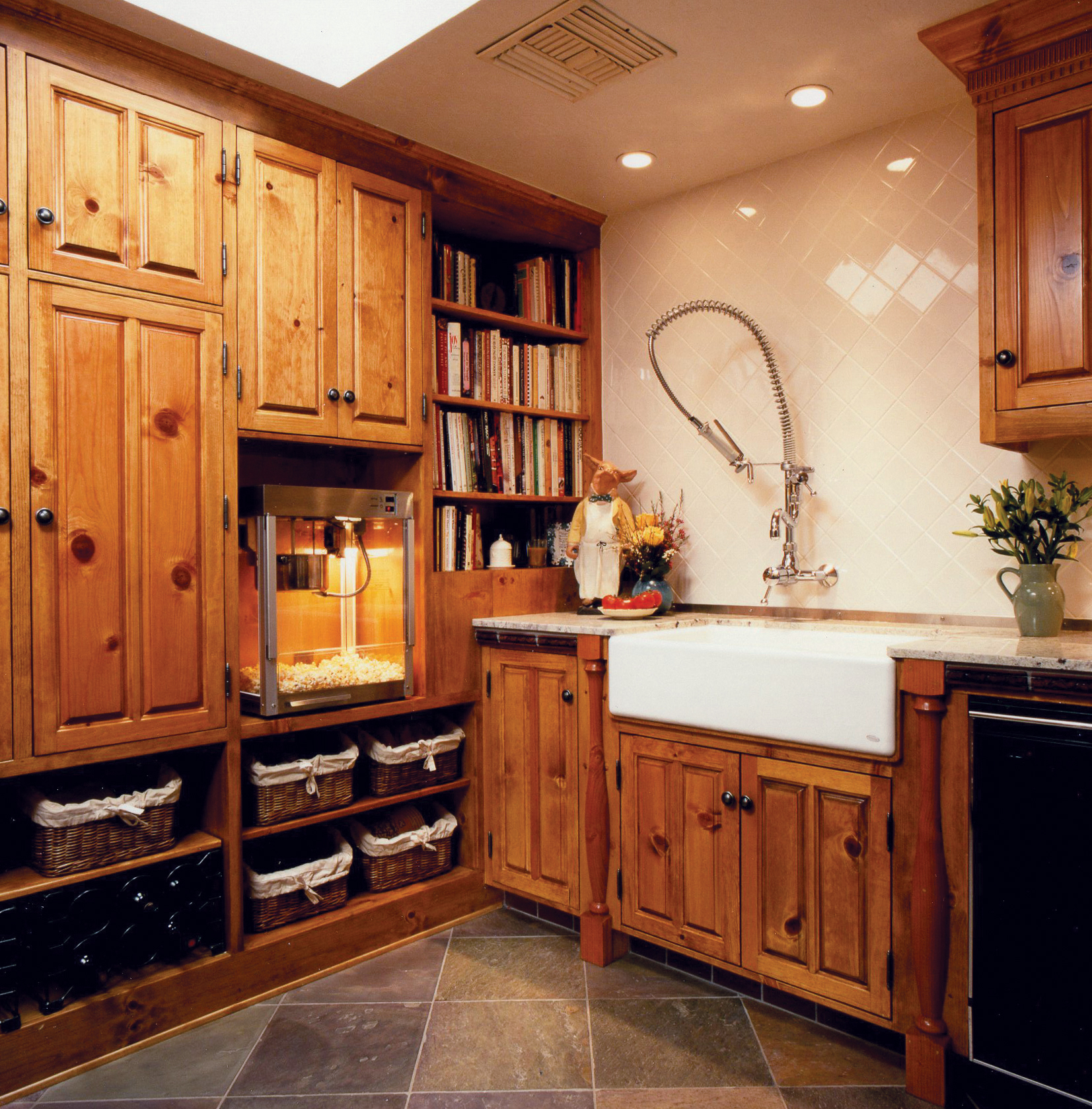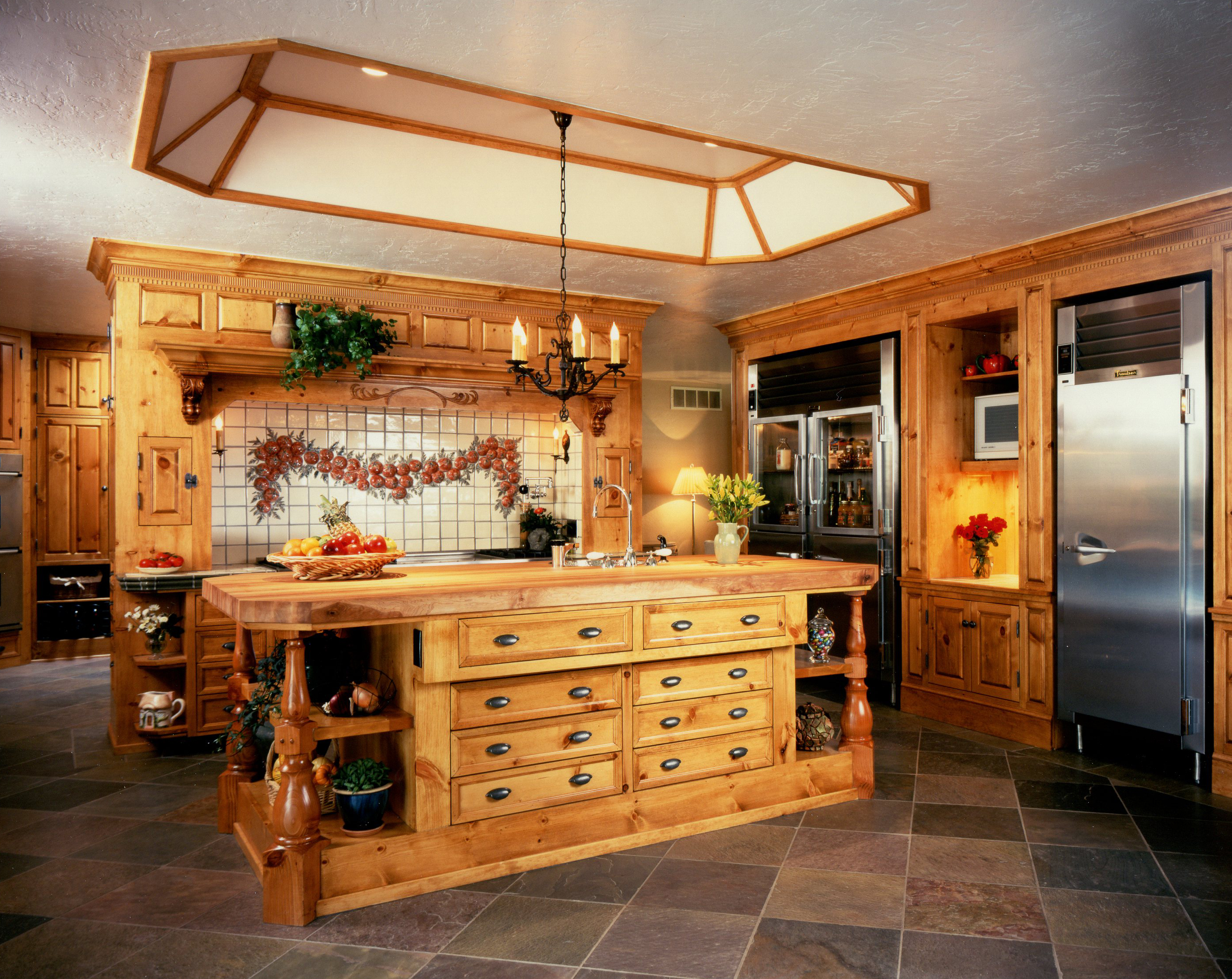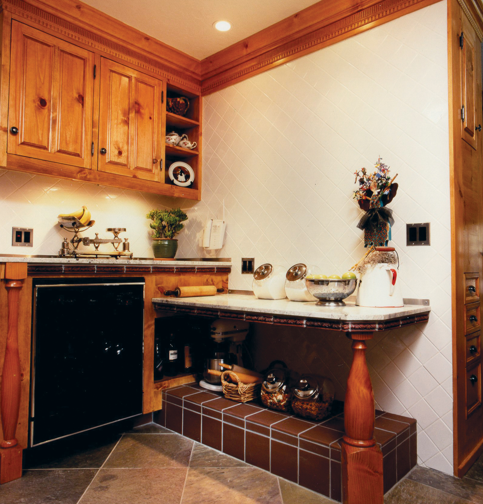 Knotty-pine custom cabinets, custom-milled knotty pine moldings and an elegant tile frieze incorporating a tomato motif contrast with the sleek efficiency of the commercial appliances.
